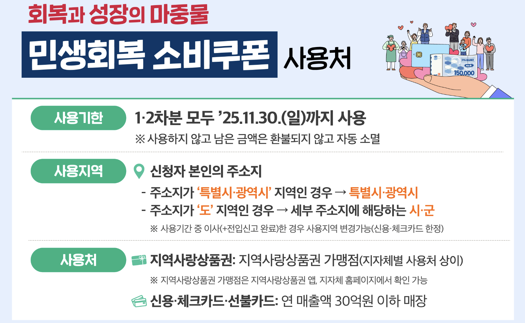 - 사용 기간 및 잔액 소멸 : 민생소비쿠폰의 사용 기간은 대부분 2025년 11월 30일까지로 한정됩니다. 이 기한이 지나면 잔액은 소멸되니 잊지 말고 사용하세요. (단, 지역화폐로 받은 경우 카드형/종이 상품권에 따라 기한이 다를 수 있으니 별도 확인이 필요합니다)