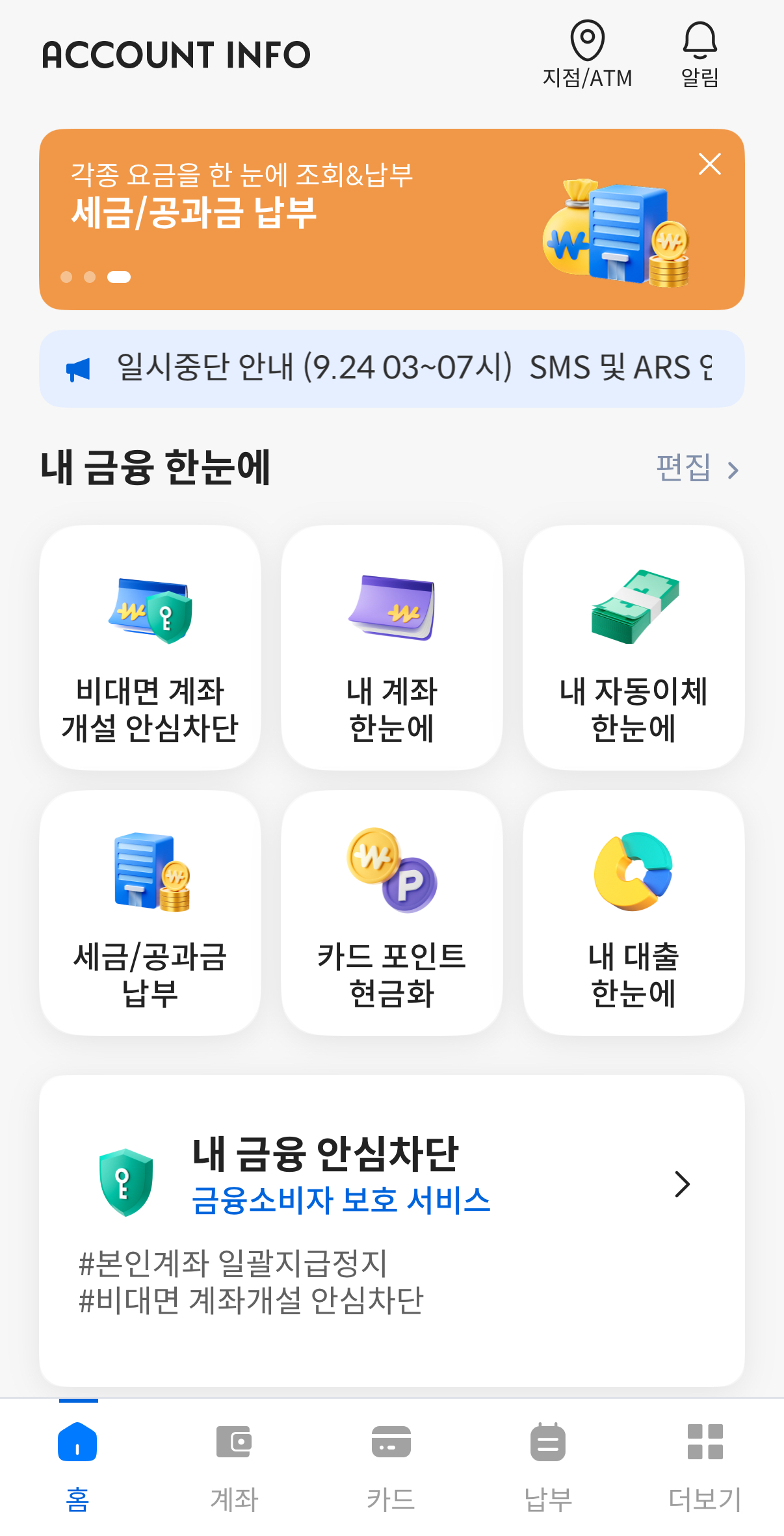 - 인증이 완료되면, 내 금융정보(계좌, 카드, 보험 등)를 한눈에 확인할 수 있는 메인화면이 나옵니다.