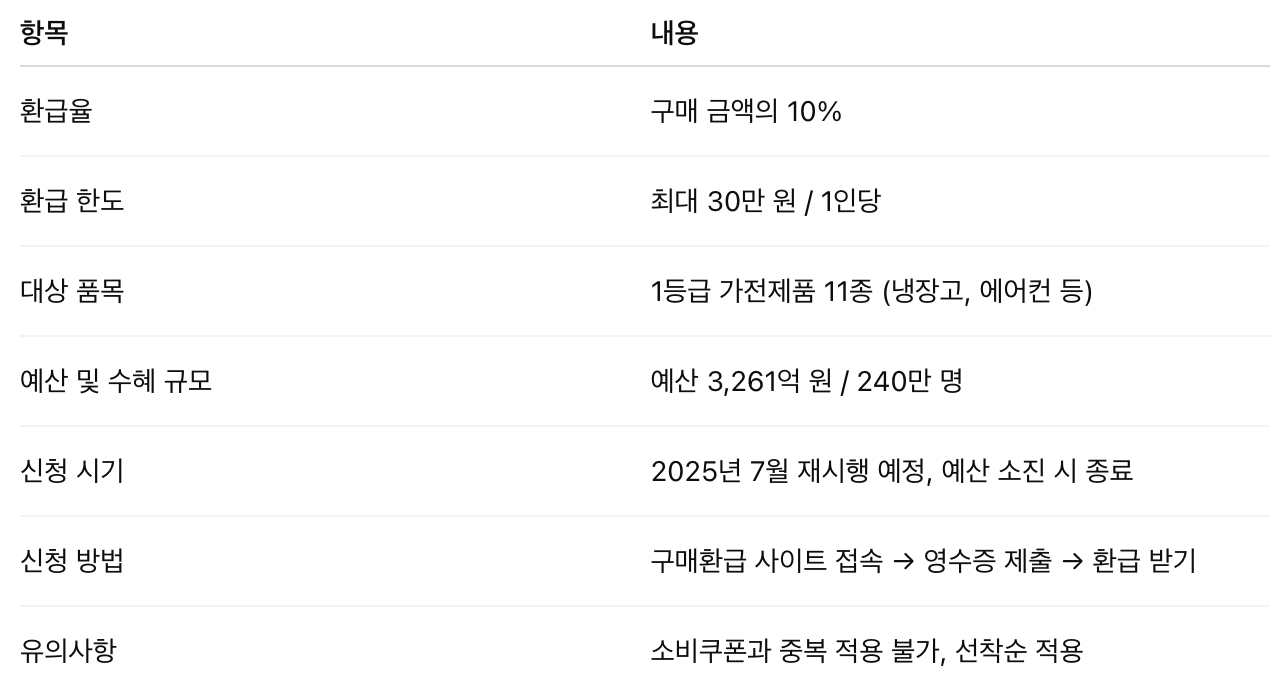 전력 절감과 경기 활성화를 동시에 겨냥해 에너지 효율 1등급 가전 구매 시 10%, 최대 30만 원 환급 정책을 추진 중입니다. 가격 부담이 큰 가전 교체를 고려하는 분들께는 실질적인 절세 효과와 환급 혜택이 크며, 선착순 예산 소진 방식을 유의하여 빠른 신청이 필요합니다.