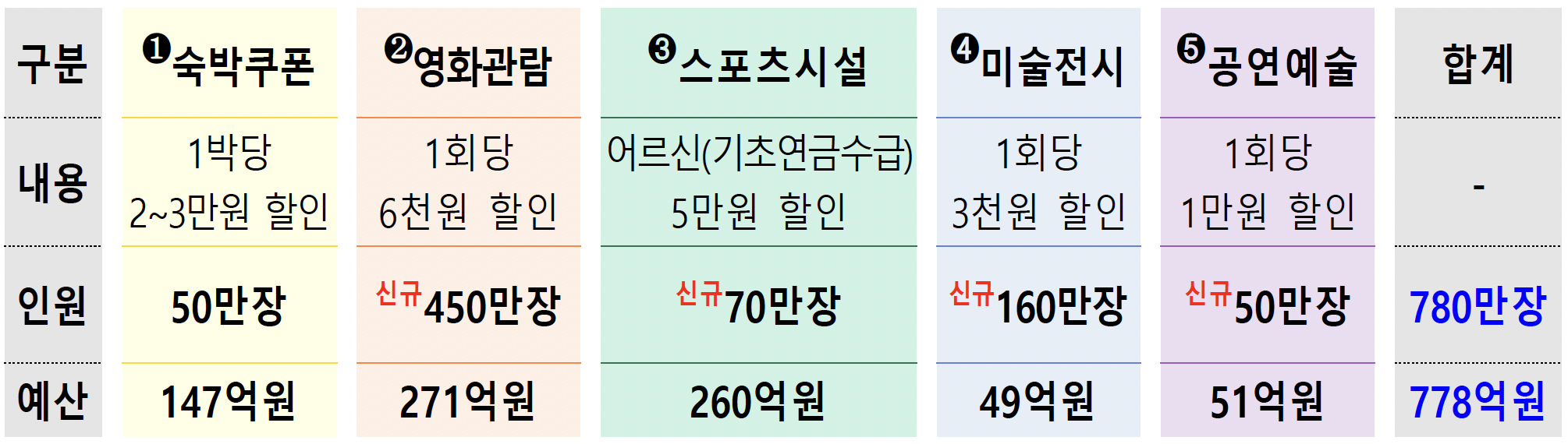 이번 민생회복 할인쿠폰 정책은 단순한 이벤트가 아닙니다. 780만장 이상의 할인쿠폰이 전국 각지에서 동시에 지급되며, 대상도 광범위합니다. (숙박, 영화, 스포츠시설, 미술전시, 공연예술 총 5개 분야)