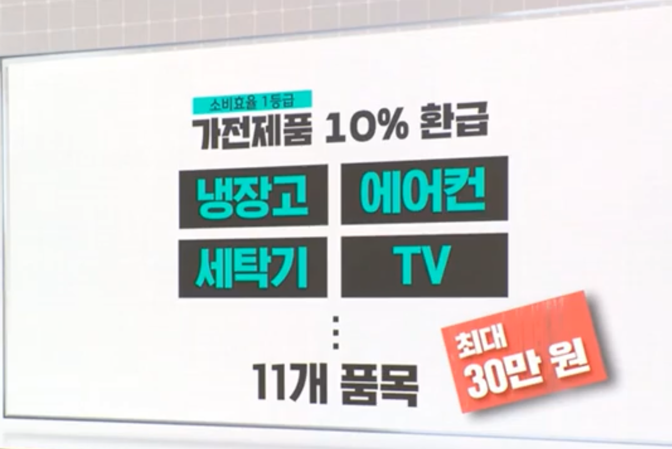 예를들어, 에어컨 가격이 300만 원이 넘으면 30만 원만 환급이 된다. 에어컨 외에도 냉장고, 김치냉장고, 세탁기, 전기밥솥, 진공청소기, 공기청정기, TV, 제습기, 의류건조기, 식기세척기 등 11개 품목이 환급 대상에 포함됩니다.