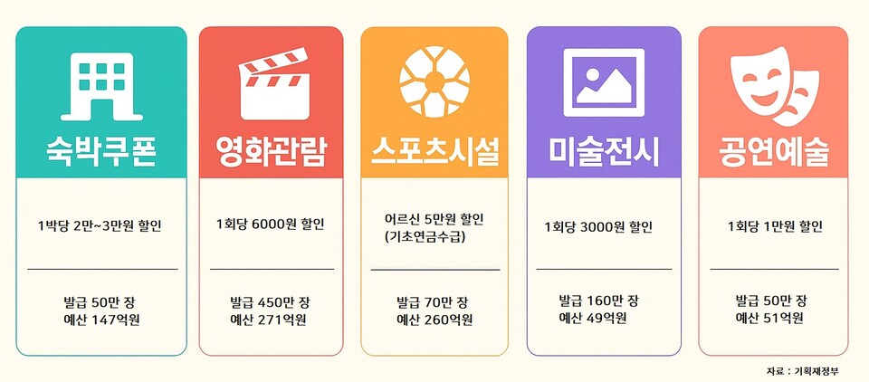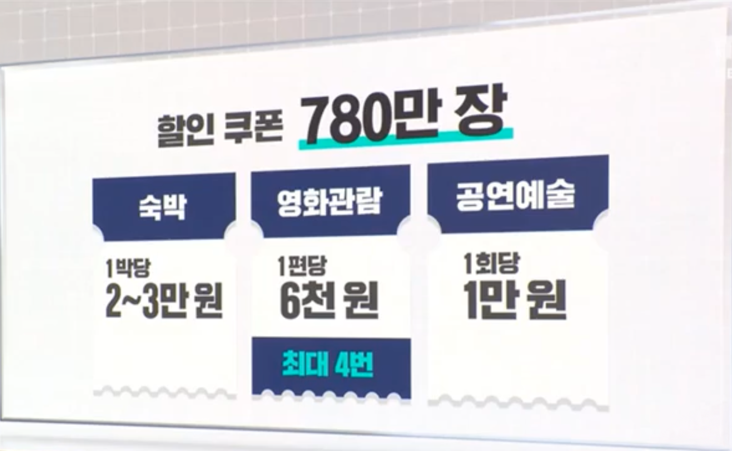 선착순으로 지급하며 할인쿠폰이 모두 소진되면 더 이상 지급하지 않는다. 영화와 전시, 공연은 1인당 2장까지 받을 수 있고, 숙박은 1인당 1장이다.