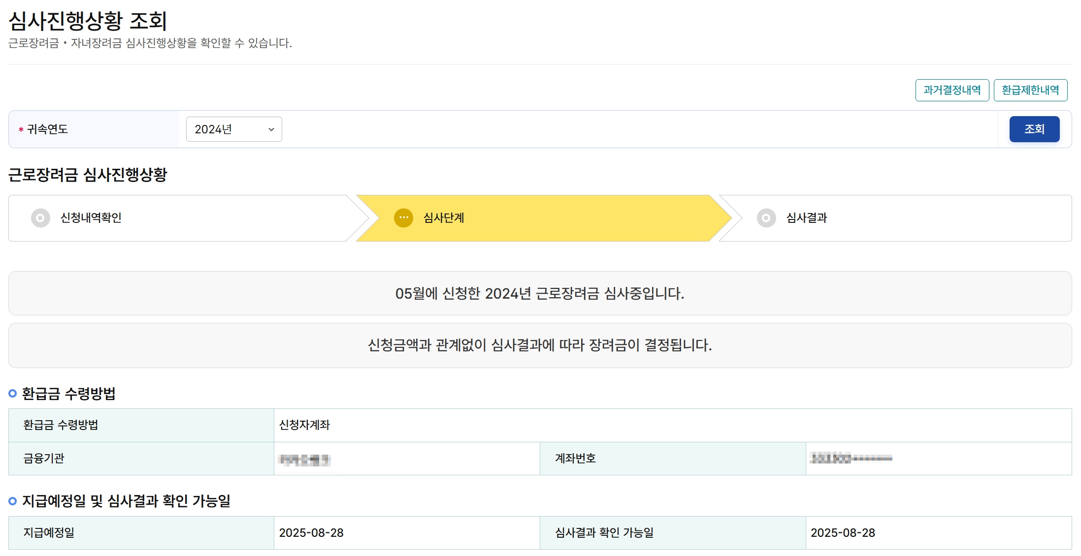 - 로그인 후 → 조회/발급 → 근로·자녀장려금 → 심사진행상황 조회 선택