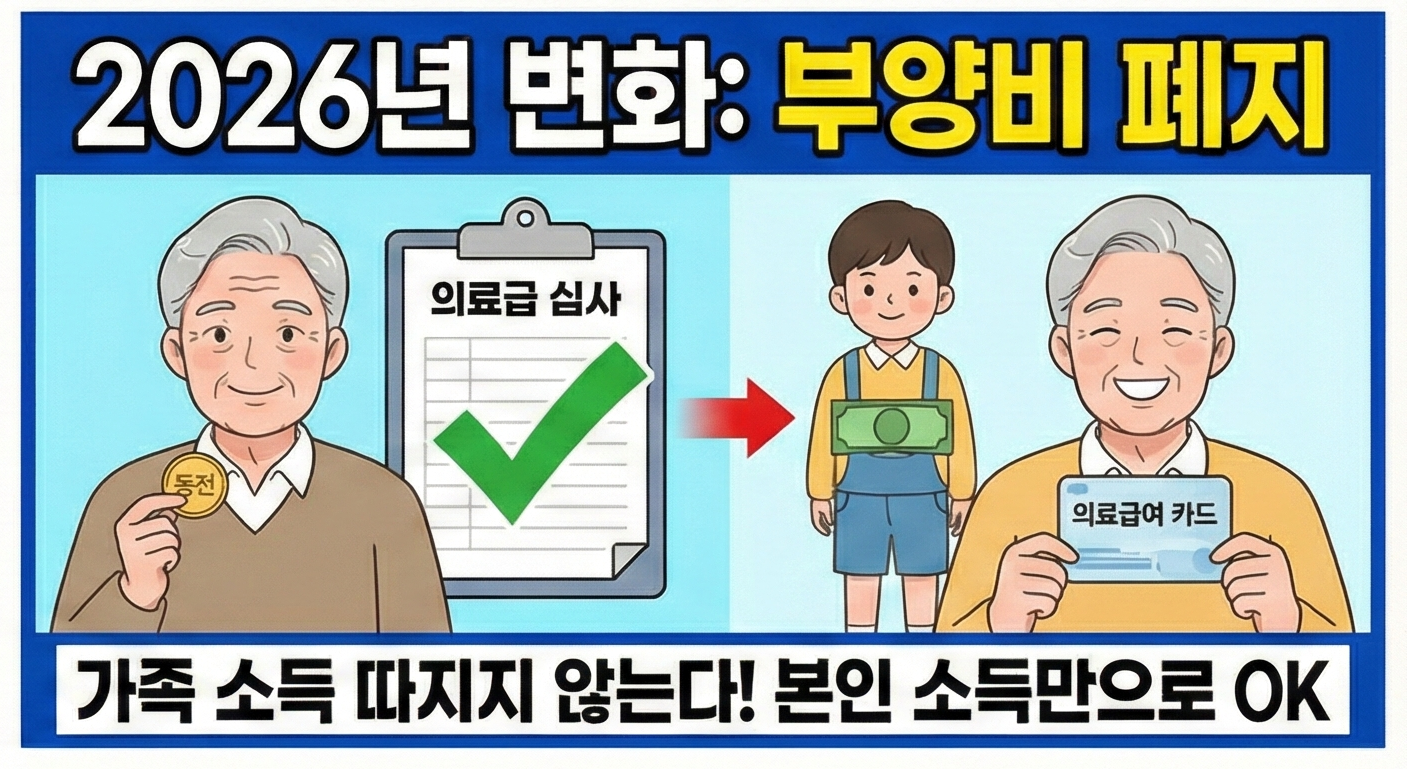 1. 핵심 변화: 2026년부터 의료급여 선정 시 가족(부양의무자)의 소득을 내 소득으로 치는 '부양비' 제도가 폐지됩니다.