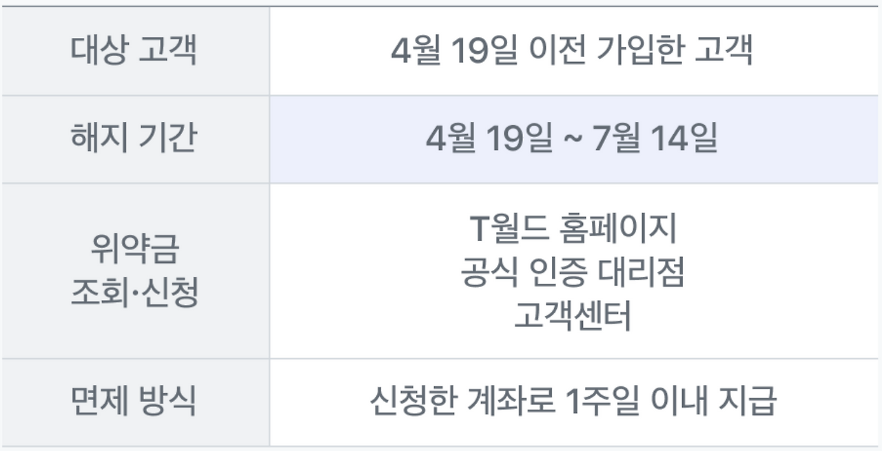 - 4월 19일(토) 00시 ~ 7월 14일(월) 24시 사이 해지 & 위약금 납부